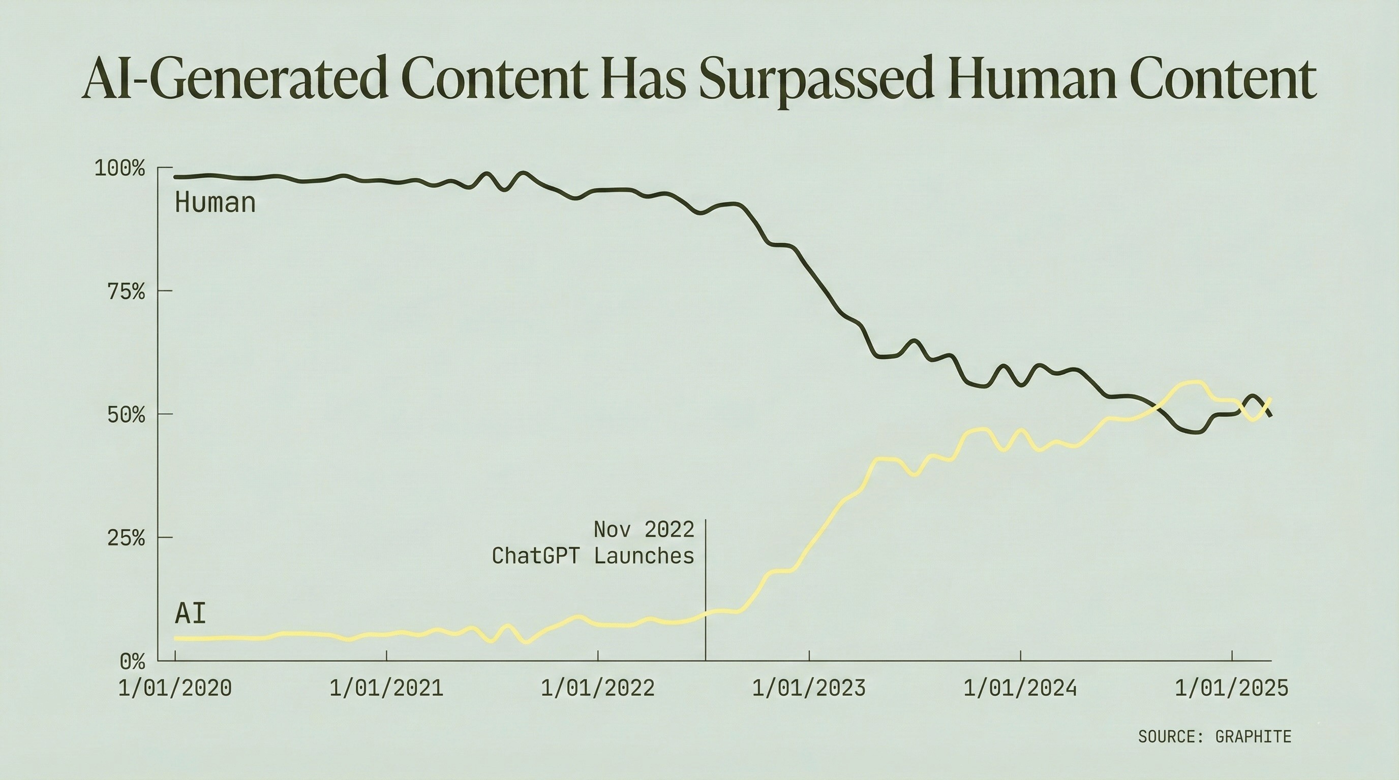 It’s safe to say that none of us are true experts in AI yet. How could we be? I’m certainly not claiming expert status myself. The technology is evolving faster than any discipline in modern marketing. One thing is very clear: AI isn’t taking over the world…but it is transforming it at a staggering pace. AI content is exploding faster than any tech shift before it.