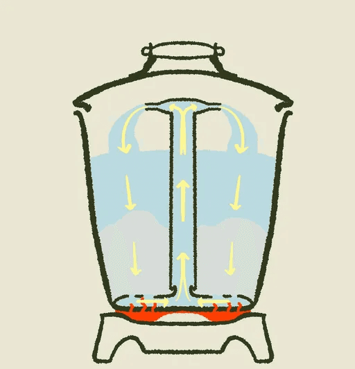 Picture this. Bialetti observes his wife using a "lessiveuse", a type of laundry machine common in French and Italian homes at the time. It was nothing like what we use today. Imagine a large metal bucket with a central tube, where clothes, water, and soap were all mixed together. As the water heated, steam pressure pushed the soapy water up through the tube, which then poured back over the clothes, washing them in a simple loop. Basic, but brilliant.